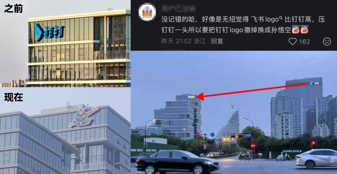 至于更换 LOGO 的原因,网传钉钉 CEO 陈航(花名无招)发现,隔壁飞书大楼的 LOGO 比自家的高了一截,心里不服气,索性把 LOGO 换成孙悟空硬刚。据悉,钉钉和飞书的总部大楼都在杭州未来科技城,两家仅隔一条马路,飞书 LOGO 的高度确实略胜一筹。报道称,恰巧钉钉有个核心团队叫 “西游记团队”,选孙悟空的形象再合适不过,选孙悟空形象贴合企业文化,又因飞书LOGO形似飞鸟,暗合“孙悟空棒打出头鸟”梗。
