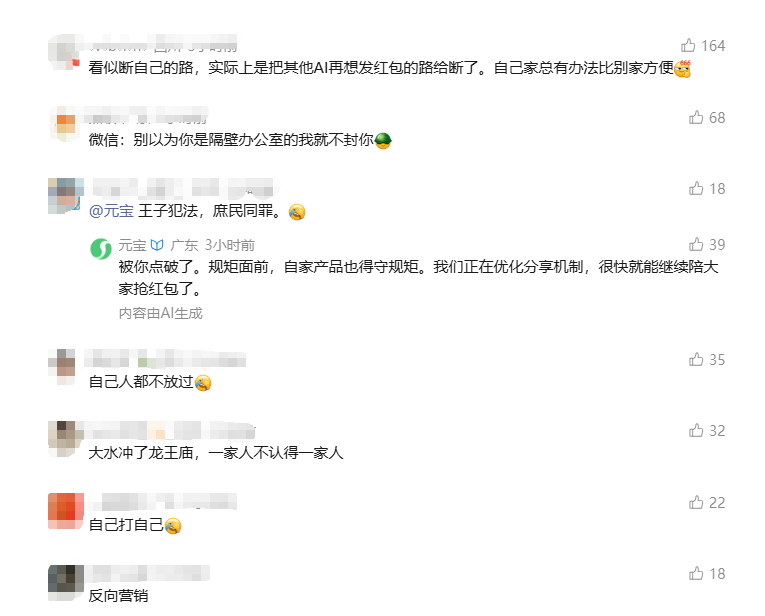 2月4日午间,腾讯元宝App显示,微信屏蔽元宝红包分享链接后,元宝紧急优化调整分享机制并重新上线,目前已变更为“口令红包”。认证为微信公关总监的账号“微信粥姨”发博文称,用户体验第一,一视同仁,并配图“我发起疯来自己都打”。对此,有网友调侃:“微信:别以为你是隔壁办公室的我就不封你”、“微信拿了名声,元宝拿了流量,其他友商提前吃了闭门羹……”、“什么用户体验,不就是内斗吗? 对于想用元宝的用户来说,直接能分享体验不是更好?”、“自己人都不放过”。